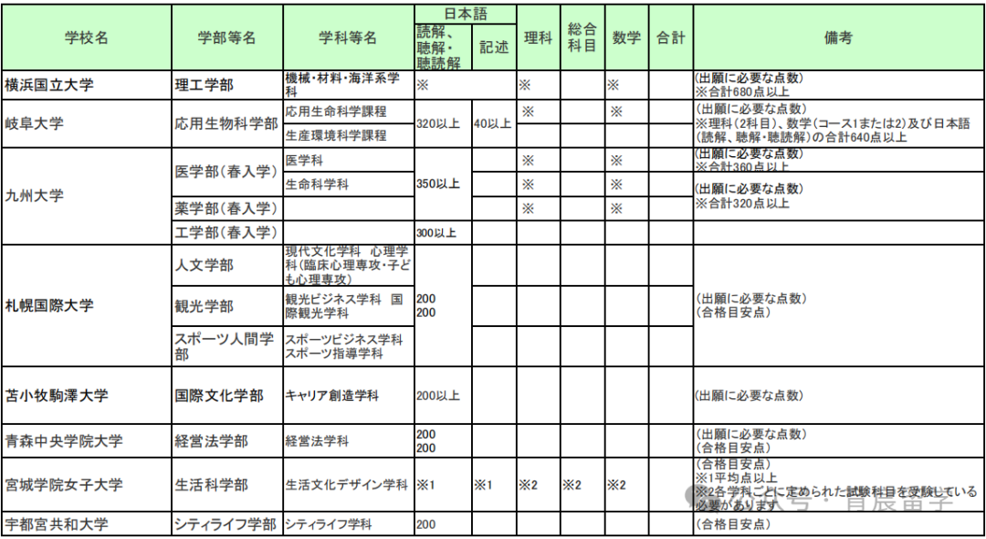医学部(春入学):医学科、生命科学科,要求留考日语350分以上(不含小论文)